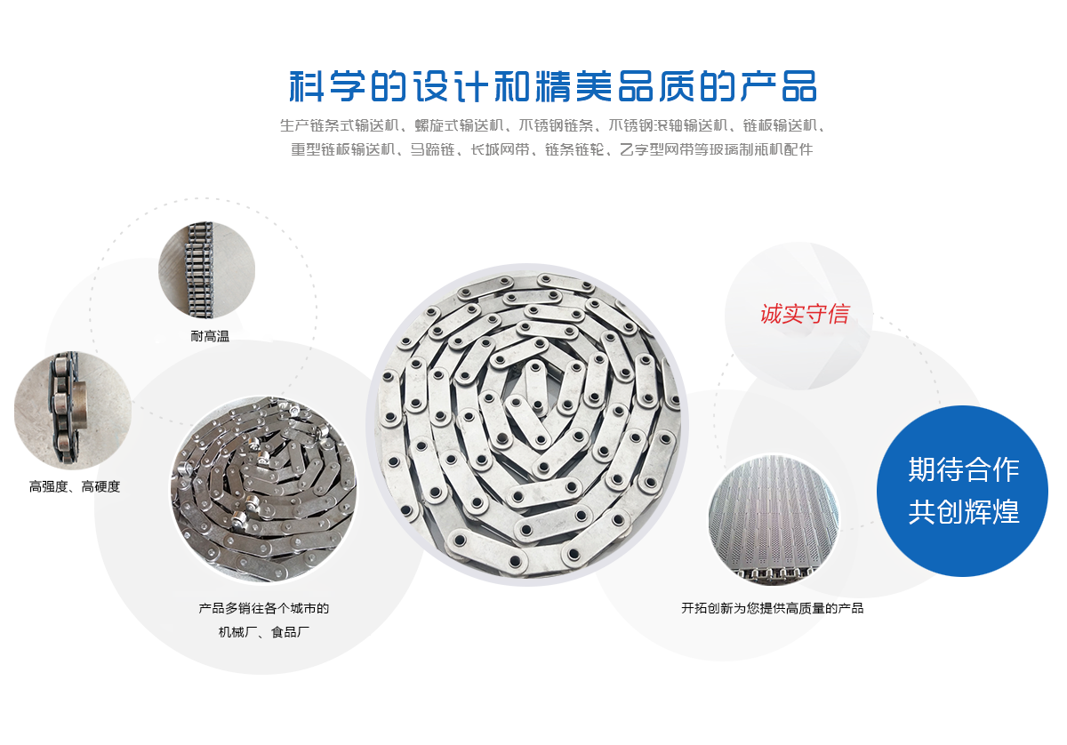 生產(chǎn)鏈條式輸送機(jī)、螺旋式輸送機(jī)、不銹鋼鏈條、不銹鋼滾軸輸送機(jī)、鏈板輸送機(jī)、重型鏈板輸送機(jī)、馬蹄鏈、長(zhǎng)城網(wǎng)帶、鏈條鏈輪、乙字型網(wǎng)帶等玻璃制瓶機(jī)配件,食品機(jī)械配件及各種網(wǎng)帶的專(zhuān)業(yè)廠家 ,多年來(lái)產(chǎn)品暢銷(xiāo)各地玻璃廠和食品廠,在玻璃制品等行業(yè)中享有較高的聲譽(yù)。公司集摸具開(kāi)發(fā)、機(jī)械設(shè)計(jì)生產(chǎn),銷(xiāo)售于一體的生產(chǎn)型企業(yè)。生產(chǎn)的自動(dòng)化流水線金屬傳動(dòng)網(wǎng)帶、鏈條等產(chǎn)品廣泛用于玻璃機(jī)械、食品機(jī)械、化纖機(jī)械、醫(yī)藥、電子、烘干機(jī)械、輪胎機(jī)械等行業(yè)。產(chǎn)品多銷(xiāo)往各個(gè)城市的機(jī)械廠、食品廠和一些涉及流水線或自動(dòng)化設(shè)備的公司。